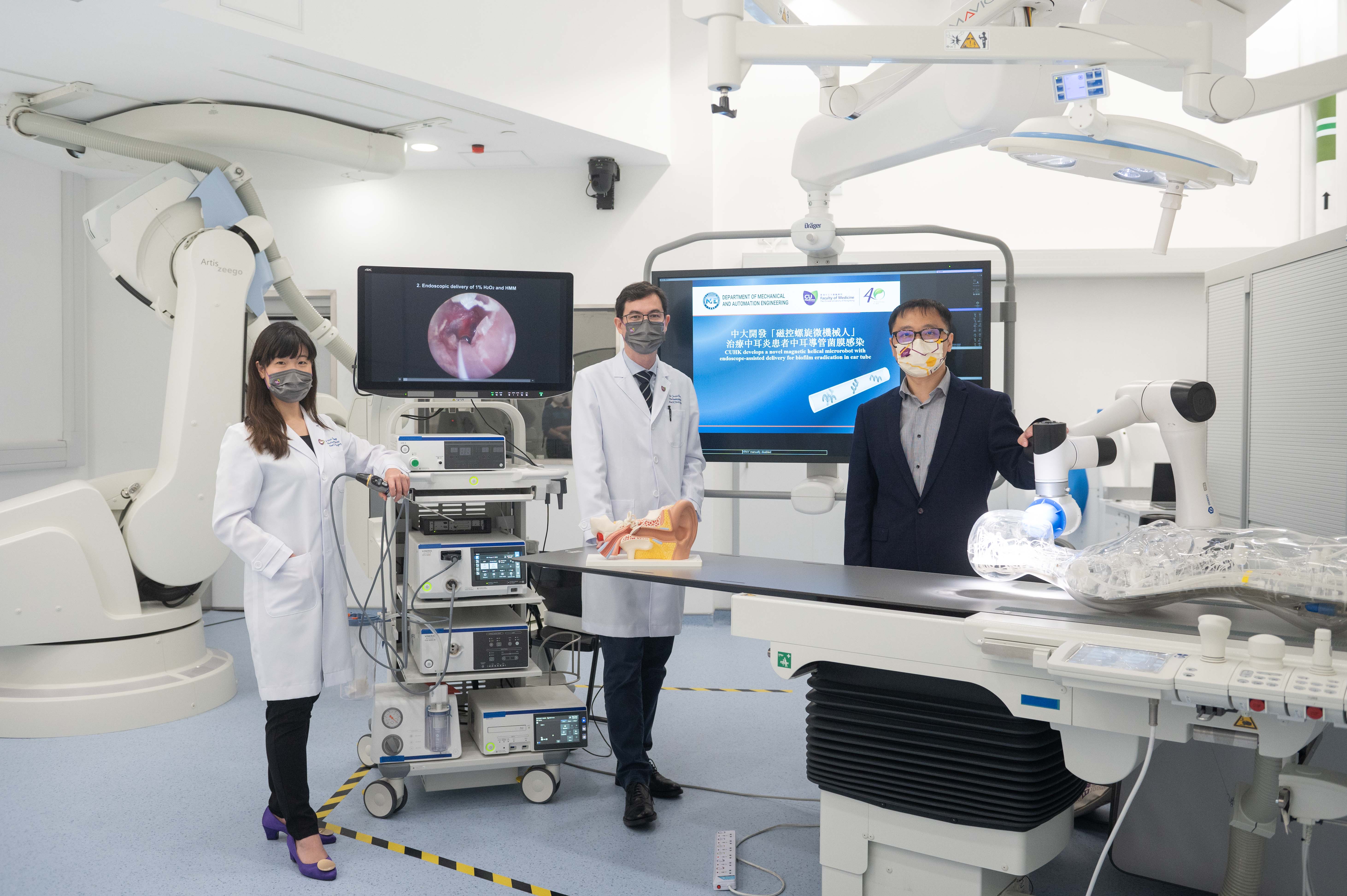 CUHK develops a novel magnetic helical microrobot with endoscope-assisted delivery for biofilm eradication in ear tubes Otitis media is an inflammation or infection located in the middle ear. It is a health problem commonly seen in children, usually caused by upper respiratory infections or bacterial infections. Some patients with fluid build-up, or effusion, need to the undergo the surgical procedure of, inserting a tympanostomy tube (also known as an ear tube or T-tube) in the tympanic membrane to drain the middle ear fluid, alleviating the effusion and pressure in the middle ear. However, bacterial biofilm may form in the ear tube over time and contribute to blockages and recurring infections. CUHK’s cross disciplinary research team developed a magnetic helical microrobot with endoscope-assisted delivery for biofilm eradication in ear tubes. The novel treatment procedure has been validated in a human cadaver ex vivo, which is a promising sign for clinical application. Study results have been published in the international journal Science Advances. Bacterial biofilms contribute to recurring infections, but eradication is difficult in the tortuous and obstructed auditory canals About 7% of children under the age of six have had otitis media with effusion. The fluid may resolve on its own within a few weeks but if the condition prevails, surgical treatment becomes necessary. Insertion of an ear tube into the tympanic membrane is a procedure to treat otitis media with effusion. In Hong Kong, it is common for adult or child patients to undergo implant of ear tube for otitis media with effusion. Biofilm builds up in the ear tube over time and contributes to otorrhea, or drainage of fluid from the ear, and debris deposition, which in turn can cause blockages and recurring infections. For severely blocked ear tubes, surgeons have to use specialised mechanical tools to clear the occlusion or replace the ear tube during endoscopy. This manoeuvre requires delicate expert skills to avoid injuries to the ossicular chain and tympanic membrane. Dr Chang Wai-tsz, Assistant Professor in the Department of Otorhinolaryngology, Head and Neck Surgery at CU Medicine explained, “Recurrent infections of ear refractory to antibiotic treatment and occlusion of the ear tube are the complications related to biofilms after operation. Antibiotics are usually used to prevent biofilm occlusion after surgery, but they cannot prevent infection in the long term, and may lead to antimicrobial resistance. Some patients who suffer from ear tube occlusion require frequent tube replacement, which increases their physical and financial burden.” Helical microrobots have chemical and mechanical effects in eradicating biofilm Hence, a research team with members from the Department of Mechanical and Automation Engineering at Faculty of Engineering, and the Department of Otorhinolaryngology, Head and Neck Surgery at CU Medicine joined hands to develop a magnetic helical microrobot with endoscope-assisted delivery for biofilm eradication in ear tube. The treatment system consists of helical microrobot, endoscope, magnetic actuation unit with robotic arm, and catheter. Surgeons first use an endoscope to deliver the helical microrobot with a catheter into the ear tube. Then they can remotely actuate the microrobot by the programmed magnetic field in the ear tube to perform biofilm eradication. Professor Zhang Li from the Department of Mechanical and Automation Engineering said, “During my post-doctoral studies at ETH Zurich in Switzerland, I was inspired by the flagellar movement (the locomotion of the tiny hairline appendages found on many plants) to develop helical microrobot. I further investigated the use of magnetic force for better motion control and applied it in the field of medical science. We learned from our counterparts in medicine about the challenge of treating recurrent infections from biofilm formation in ear tubes. From there, we developed helical microrobot that can promote a catalytic reaction to produce diffusion of reactive oxygen species and kill bacteria cells. So the microrobots have both chemical and mechanical methods of eradicating biofilm. The precision movement of the microrobot enables it to perform tasks harmlessly in a confined space with high accuracy, while inducing no pain.” Dr Jason Chan Ying-kuen, Associate Professor in the Department of Otorhinolaryngology, Head and Neck Surgery at CU Medicine said, “The novel treatment procedure has been validated in a human cadaver ex vivo, which is a promising sign for clinical application. The invention can provide a more manageable alternative to the current treatment and alleviate the physical and psychological pressure from repetitive ear tube replacement. Next, we need to acquire more evidence about the safety and stability of the system to promote clinical application.” Professor Joseph Sung, Dean of Lee Kong Chian School of Medicine and CUHK’s Emeritus Professor, said, “Although biofilm has been known for quite some time, the clearance of biofilm has been an unsolved problem for decades. So far, no medication has proven to be useful in clearing the microbes once they are established on the surface as a layer. This study represents a major breakthrough using both mechanical and chemical methods in the same modalities. Its application is not limited to ear tubes for otitis media: potentially it can be used in other medical devices or implants placed in the human body where biofilm infections can occur.” This study was supported by Research Grants Council, Innovation and Technology Commission, Chow Yuk Ho Technology Centre for Innovative Medicine, CUHK T Stone Robotics Institute, Shenzhen Institutes of Advanced Technology (SIAT) of the Chinese Academy of Sciences (CAS) – CUHK Joint Laboratory of Robotics and Intelligent Systems, and Multi-scale Medical Robotics Center under InnoHK. (extracted from the press release issued on 27 Oct 2